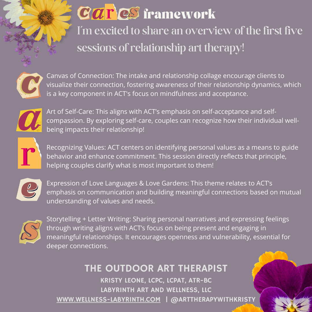 Art Therapy Project: Partners design a visual representation of their mental health "garden," using symbols and imagery to express their current emotional state and self-care practices. This aligns with ACT’s emphasis on self-acceptance and self-compassion. By exploring self-care, couples can recognize how their individual well-being impacts their relationship.